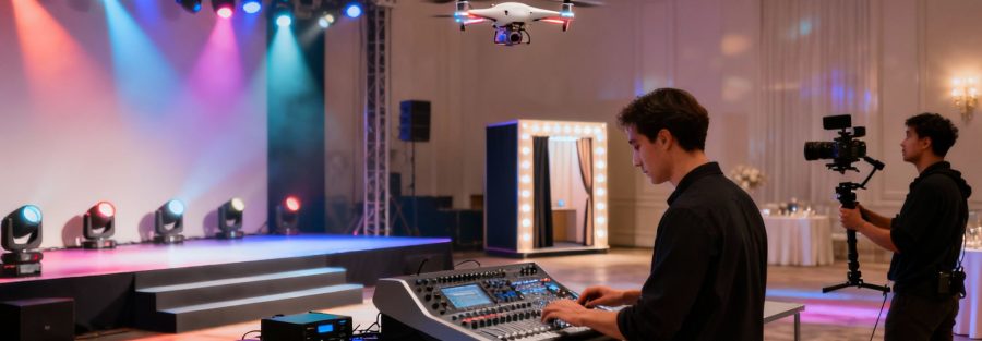Primary Services DJ/MC, Sound Systems, Uplighting, Photo Booths, Photography, Videography (including drone), Special Effects (Cold Sparks, Haze), Gobo Projections, Event Coordination.