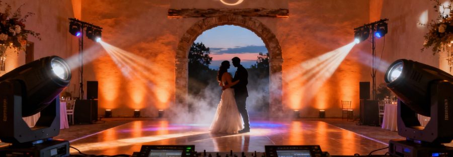 Professional wedding DJ lighting is all about creating an atmosphere. It’s performance-grade gear that can change colors, move with the music, and create special effects that build excitement throughout the night. It’s the difference between a dinner and a party.